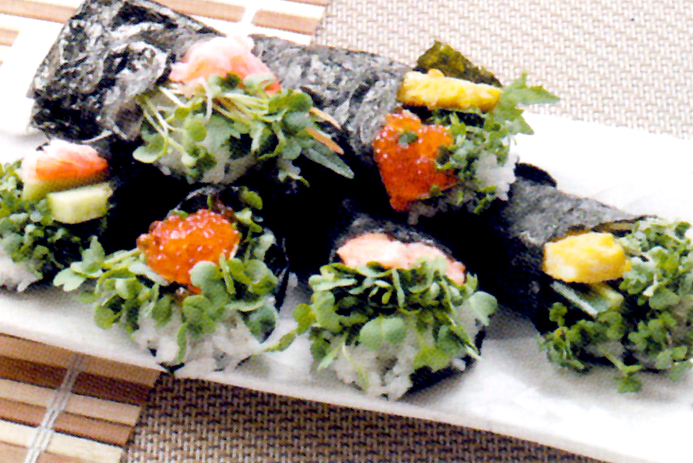 ①米は酒を入れて炊き、Aをまわしかけて切るように混ぜる。②かいわれ、ブロッコリースプラウトを洗い根を切る。③きゅうりは短冊切り、溶き卵で卵焼きを作る。④海苔に、①②③と好みの具材をのせて、巻いて出来上がり。