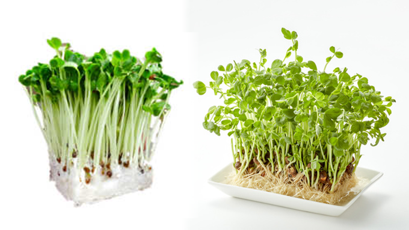 えんどう豆(グリーンピース)の発芽したもので、最近まで中華料理では高級食材でしたが、かいわれ栽培技術を応用し、手軽に食されるようになりました。根を切った後に再度栽培するとまた芽が出てきます。